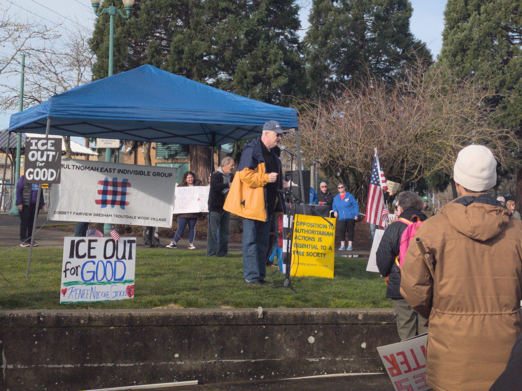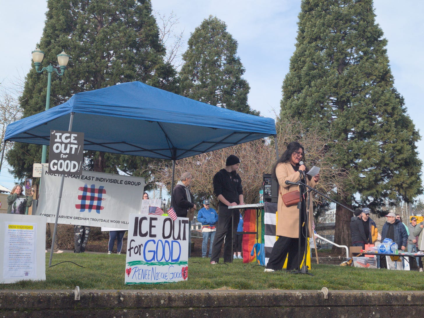 On Saturday January 31, 2026 the activist group Multnomah East Indivisible held a “ICE Out for Good” rally in opposition to the presence of Immigration and Customs Enforcement agents in the community. The protests were held in response to the killings of two Minnesotans, Renee Good and Alex Pretti, at the hands of Immigration and Customs Enforcement and Customs and Border Protection agents.