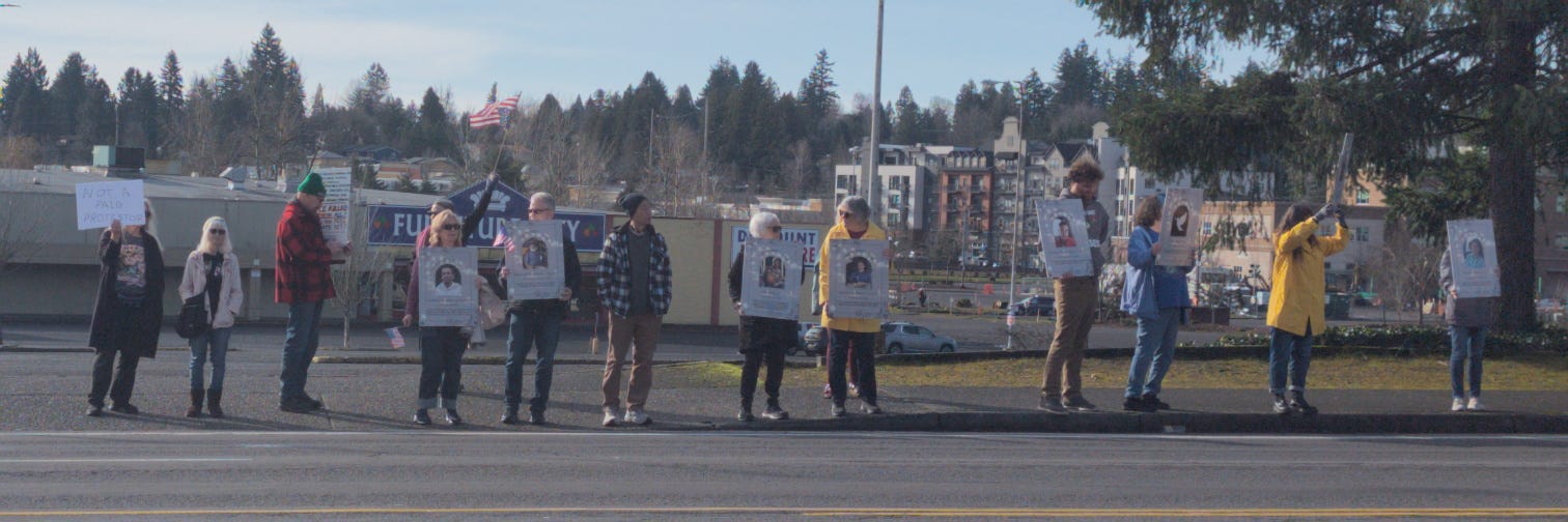 Protesters marched along Burnside with a set of signs with the names and photos of people who are known to have either been killed by immigration officers or died while in ICE custody in 2025 through January of 2026. According to reporting from The Guardian 32 people died in ICE custody in 2025 and eight had died in January of 2026. Dunham said, “We are remembering those who lost their lives at the hands of ICE” before the signs were brought out to lead the march.