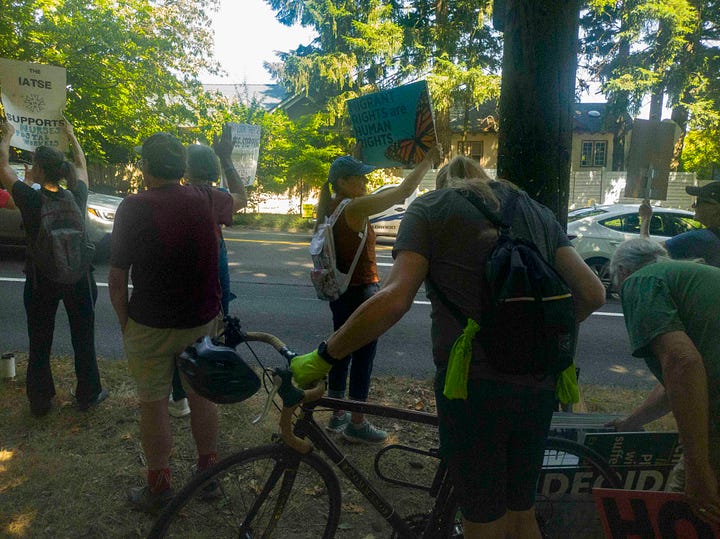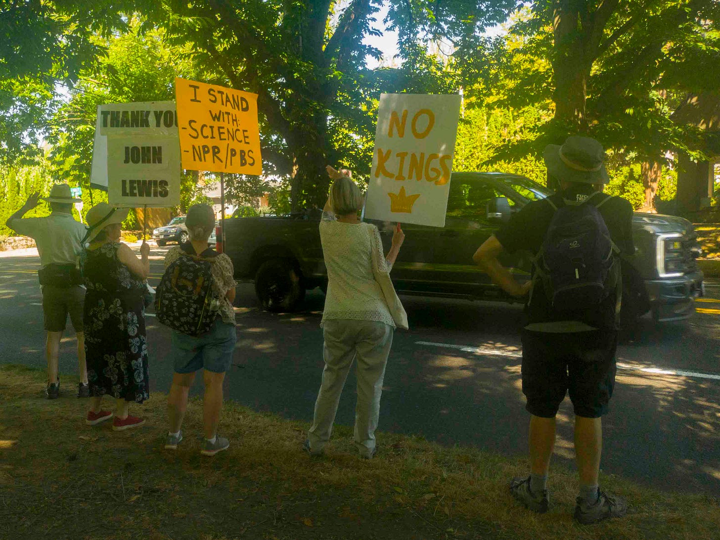 One such protest took place at the SE Stark St and Cesar E. Chavez Blvd intersection near Laurelhurst Park. The protest was one of a series of protests that have followed since the Hands Off and No Kings day protests called for by Indivisible and 50501. The signs I saw protesters holding showed that continuity: some warned that Trump wanted to be a king, some held sings protesting ICE, some were concerned about the cutting of funding to NPR and to state Medicaid programs. One sign I saw protested the US sending military aid to Israel.